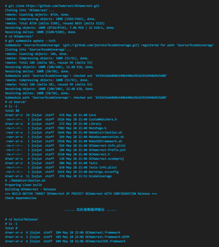 下载源码后,进入Source目录,执行MakeDistribution.sh脚本,将会在Source/build/Release下生成OCHamcrest.framework、OCHamcrestIOS.framework和OCHamcrest.framework.dSYM