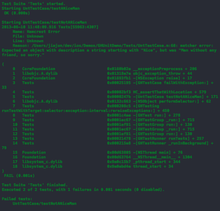 GHUnit通过Console中的内容给开发者提供帮助,可以快速定位程序出错的位置,这一点比OCUnit做的要好。