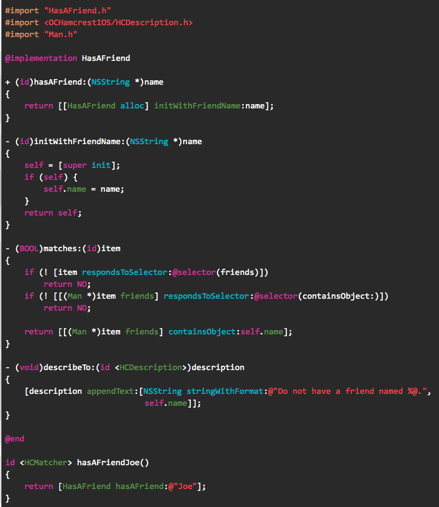 OCHamcrest官方给出的自定义匹配规则示例是:onASaturday,判断一个NSDateComponents实例是否为星期六。本文以上一节使用的Man对象为例,匹配某Man实例是否有一个名为“Joe”的好友,规则命名为:hasAFriendJoe。