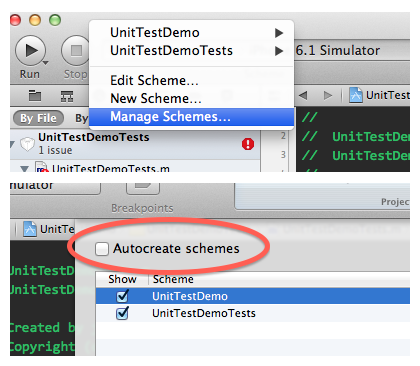 向已有工程中添加一个测试Target时,XCode会自动生成一个Scheme,运行单元测试用例和Build原工程需要切换不同的Scheme。如果认为切换Scheme非常麻烦,也可以在添加Target之前,在“Manage
