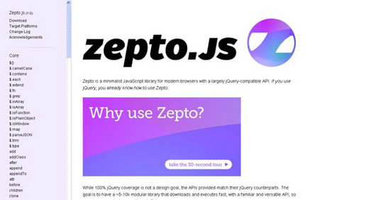 Zepto.js是支持移动WebKit浏览器的JavaScript框架,具有与jQuery兼容的语法。轻量级,大小为2-5k的库,通过不错的API处理绝大多数的基本工作。