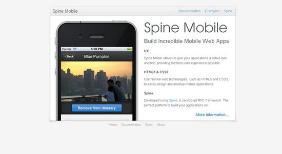 Spine Mobile是一个构建在SpineJS之上的JavaScript框架,用于构建看起来外观像本地应用的移动Web应用。该框架带有专用控制器、面板布局、硬件加速的转换和触摸事件。