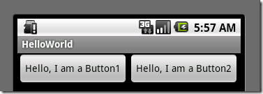 <?xml version="1.0" encoding="utf-8"?> <LinearLayout xmlns:android="http://schemas.android.com/apk/res/android" android:layout_width="fill_parent" android:layout_height="fill_parent" android:orientation="horizontal"><!-- have an eye on ! --> <Button android:id="@+id/button1" android:layout_width="wrap_content" android:layout_height="wrap_content" android:text="Hello, I am a Button1" android:layout_weight="1" /> <Button android:id="@+id/button2" android:layout_width="wrap_content" android:layout_height="wrap_content" android:text="Hello, I am a Button2" android:layout_weight="1" /> <Button android:id="@+id/button3" android:layout_width="wrap_content" android:layout_height="wrap_content" android:text="Hello, I am a Button3" android:layout_weight="1" /> <Button android:id="@+id/button4" android:layout_width="wrap_content" android:layout_height="wrap_content" android:text="Hello, I am a Button4" android:layout_weight="1" /> <Button android:id="@+id/button5" android:layout_width="wrap_content" android:layout_height="wrap_content" android:text="Hello, I am a Button5" android:layout_weight="1" /> </LinearLayout> |