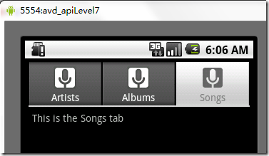 1)、在项目中建立三个隔离的Activity类:ArtistisActivity、AlbumActivity、SongActivity。它们每个表示一个分隔的标签。每个通过TextView显示简单的一个消息,例如: