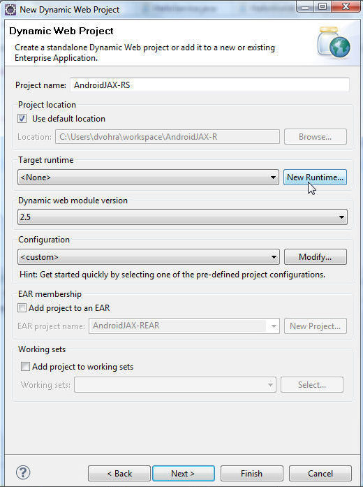 指定项目名称(例如 AndroidJAX-RS)并单击 New Runtime,为您的