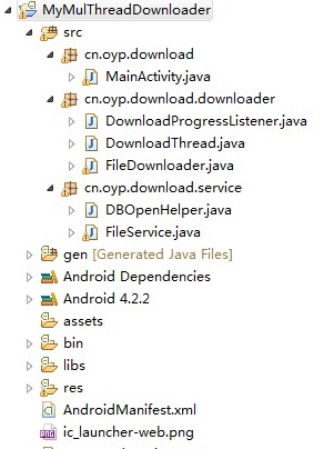 <span style="font-size:18px;">package cn.oyp.download.service; import android.content.Context; import android.database.sqlite.SQLiteDatabase; import android.database.sqlite.SQLiteOpenHelper; public class DBOpenHelper extends SQLiteOpenHelper { // 数据库文件的文件名 private static final String DBNAME = "download.db"; // 数据库的版本号 private static final int VERSION = 1; public DBOpenHelper(Context context) { super(context, DBNAME, null, VERSION); } @Override public void onCreate(SQLiteDatabase db) { db.execSQL("CREATE TABLE IF NOT EXISTS filedownlog