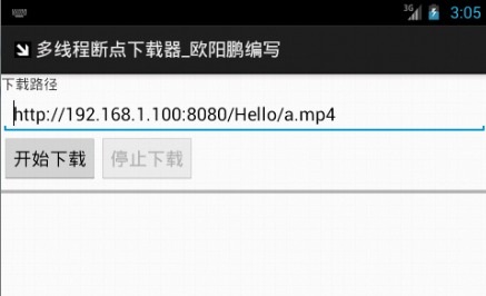 <span style="font-size:18px;">package cn.oyp.download; import java.io.File; import android.app.Activity; import android.os.Bundle; import android.os.Environment; import android.os.Handler; import android.os.Message; import android.view.View; import android.widget.Button; import android.widget.EditText; import android.widget.ProgressBar; import android.widget.TextView; import android.widget.Toast; import cn.oyp.download.downloader.DownloadProgressListener; import cn.oyp.download.downloader.FileDownloader; public class MainActivity extends Activity { /** 下载路径文本框 **/ private EditText pathText; /** 下载按钮 **/ private Button downloadButton; /** 停止下载按钮 **/ private Button stopbutton; /** 下载进度条 **/ private ProgressBar progressBar; /** 下载结果文本框,显示下载的进度值 **/ private TextView resultView; /** Hanlder的作用是用于往创建Hander对象所在的线程所绑定的消息队列发送消息 **/ private Handler handler = new UIHander(); @Override protected void onCreate(Bundle savedInstanceState) { super.onCreate(savedInstanceState); setContentView(R.layout.activity_main); /** 初始化各控件 **/ pathText = (EditText) this.findViewById(R.id.path); downloadButton = (Button) this.findViewById(R.id.downloadbutton); stopbutton = (Button) this.findViewById(R.id.stopbutton); progressBar = (ProgressBar) this.findViewById(R.id.progressBar); resultView = (TextView) this.findViewById(R.id.resultView); /** 设置按钮的监听 **/ ButtonClickListener listener = new ButtonClickListener(); downloadButton.setOnClickListener(listener); stopbutton.setOnClickListener(listener); } /** * Hanlder的作用是用于往创建Hander对象所在的线程所绑定的消息队列发送消息 */ private final class UIHander extends Handler { public void handleMessage(Message msg) {