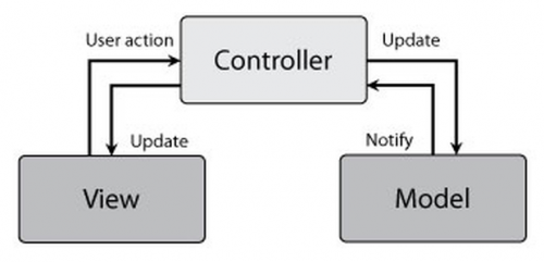 用户行为发生在一个视图,比如一个按钮点击。 视图将消息发送给控制器。 如果有必要,控制器与模型。 控制器通过信息返回到视图。