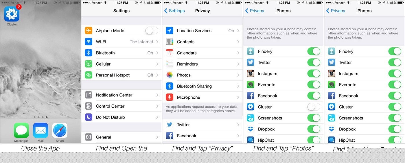 Cluster 是 Mulligan 设计的第一个原生应用。他过去的经验多集中于网页版应用的设计。事实证明,网页应用和手机原生应用在与用户互动方面有极大不同。对于网页应用而言,你需要吸引客户去访问那一个页面。而对于原生应用而言,在吸引用户下载的基础上,还要获取对相册、通讯录、位置等个人信息的访问权限。