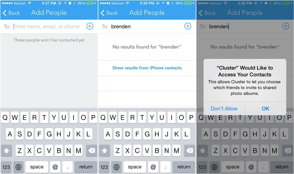 从上图可以看出,Cluster 的用意是让用户自己意识到,通讯录访问权限给他们带来的便利。当用户手动添加好友时,Cluster 会不经意地跳出连接通讯录的选择,这种方法在用户测试中获得了近 100% 的通过率。