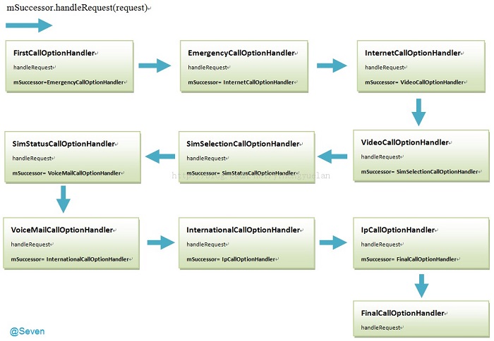 ListIterator<CallOptionBaseHandler> iterator = mCallOptionHandlerList.listIterator(); CallOptionBaseHandler previousHandler = iterator.next(); while (iterator.hasNext()) { CallOptionBaseHandler currentHandler = (CallOptionBaseHandler)iterator.next(); previousHandler.setSuccessor(currentHandler);//也就是说前一个对象的mSuccessor对象是当前的OptionHanderHandler previousHandler = currentHandler; } |
