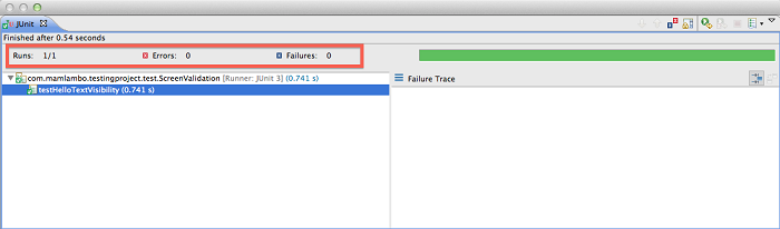 所有的测试方法必须用“test”做前缀。上面,我们已经创建了一个测试名为“HelloTextVisibility”的方法。如果测试通过或失败,assertFalse()都会被调用。(assertTrue()方法只有是true时调用。)