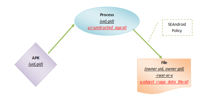 在图2中,红色标注的即为SEAndroid安全上下文。其中,u:r:unstructed_app:s0描述的是用户安装的APK所运行在的进程的安全上下文,而u:object_r:app_data_file:s0描述的是用户安装的APK在运行过程中生成的数据文件的安全上下文。