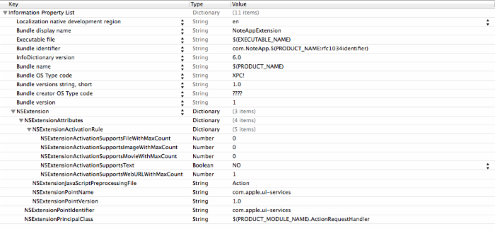 NSExtensionActivationSupportsWebURLWithMaxCount 属性设置为1,该设置让扩展知道我们需要请求一个URL。
