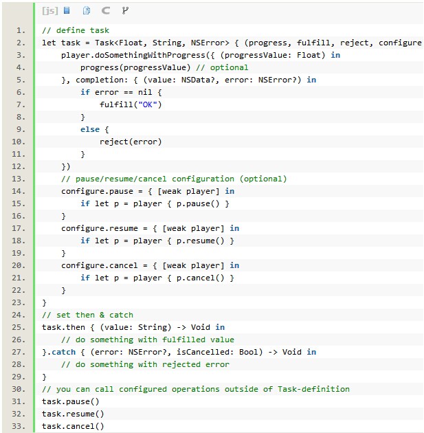 SwiftTask是使用Swift语言编写的状态机,拥有许多和他人创建的业务工作流任务的用例,综合了Promise + progress + pause + cancel,使用SwiftState(状态机)。
