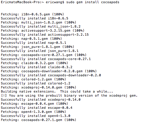 等上十几秒钟,CocoaPods就可以在你本地下载并且安装好了,不再需要其他设置。