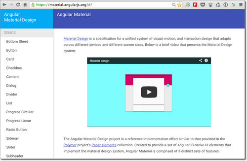 Material Design反映了Google基于Android 5.0 Lollipop操作系统的原生应用UI开发理念,而AngularJS还发起了一个Angular Material Design项目,为应用开发者提供一组完整的实现Material Design的AngularJS UI元素。这听上去不错,但要深究或展示实际范例还为时尚早,感兴趣的开发者可登陆Angular Material官网了解最新进展,或进入GitHub下载源码尝鲜。