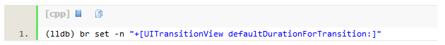我们在UIKit的类库中发现了这样一个函数:[UITransitionView defaultDurationForTransition:],并在这个方法的位置加一个断点: