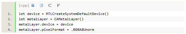 在iOS设备里,设备是GPU的抽象,这符合MTLDevice的协议,它们是你在Metal中处理的根对象,并且帮助构建其他的东西,其中包括纹理、缓冲区和管道的状态。创建一个是相当简单的,但是为了使用Metal去获取屏幕上的任意东西,你需要配合UIKit使用一个专门的子类CA层“CAMetalLayer”。你告知它交流的是哪个设备并为它提供一个像素格式“BGRA8Unorm”,这是基本的一个8位的颜色组件格式。