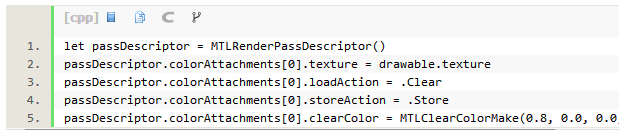 为了清除屏幕或进行其他的操作,我们需要构建所谓的渲染通道描述符。它封装了你想要对帧缓存纹理所做的行为,以下的代码就是一个渲染通道配置的示例: