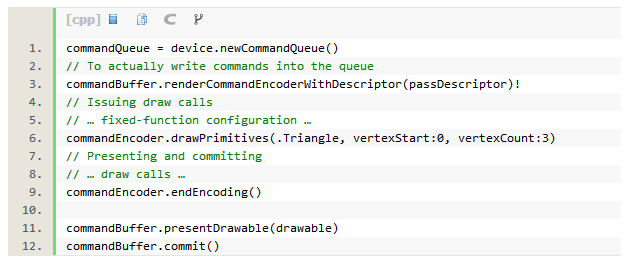 为了提交工作至GPU,我们以Command Queue开始,它是一个MTLCommandQueue协议,是提交工作的一个线程安全方式。为了能够在GPU上做一些实际意义上的事情,我们提交指令缓存组成的编码或渲染由指令编码器编写的指令。Command Queue只是一个串行队列,以一个有组织的方式分派工作至GPU。你可以通过多线程提交一个Command Queue,因为它是一个人固有的线程安全对象。使用以下的代码可以构建出一个: