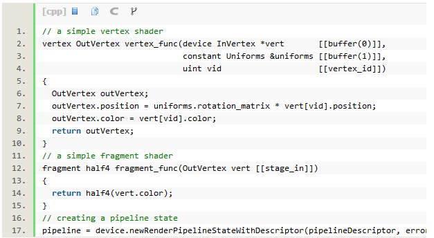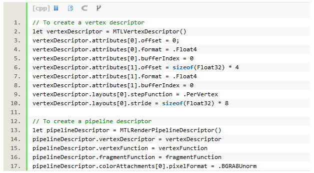 Metal中的渲染管道是一个实际上的对象,不仅仅是一个抽象的概念。这是一个图形状态的预编译组,包括一个顶点和片段着色器/函数,伴随着每一对着色器。管道的交换是廉价的,但创建却是昂贵的,因为他们采用着色器代码并将它编译到目标硬件中,并在GPU上运行。
