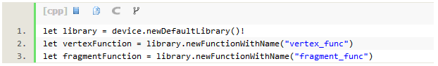 为了获取我们编写的顶点和分段函数,我们需要一个被称为库的对象。库是可以通过名称检索的函数合集;默认库由所有的顶点着色器组成,已经编译到你的App库中。构建一个库和函数: