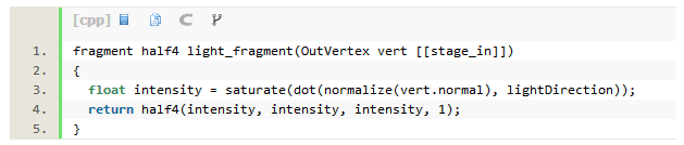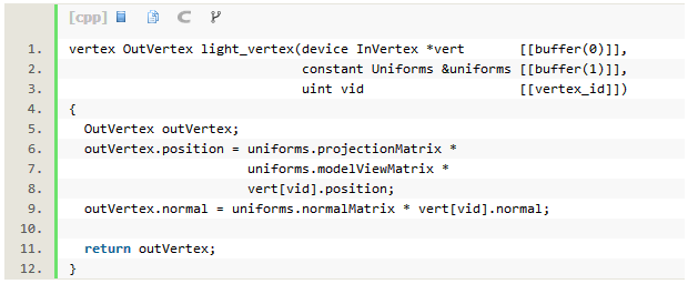 一个非常基本的照明形式被称为漫射照明。漫射是用来描述管线照射到表面并向各个方向散射的术语。相对比的是镜面反射,管线将会集中到一个亮点。计算漫射,你只需要曲面法线和光线的方向。这两个向量的数量积是漫射光线的强度,或表面特定点的辐射值。为了在Metal着色器中做这个,我们写了一个顶点函数采用在一个正常空间,并把它转换到世界空间。