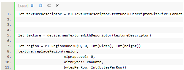 提到纹理,我们将每个顶点使用2D纹理坐标关联。这个使用逐像素漫射颜色替代顶点颜色。从UIImage中加载纹理数据,我们利用CG去绘制一个UIImage到一个位图的上下文,然后复制像素数据到MTLTexture中。