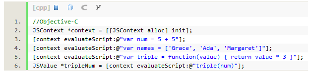 像JavaScript这类动态语言需要一个动态类型(Dynamic Type), 所以正如代码最后一行所示,JSContext里不同的值均封装在JSValue对象中,包括字符串、数值、数组、函数等,甚至还有Error以及null和undefined。