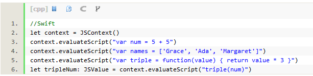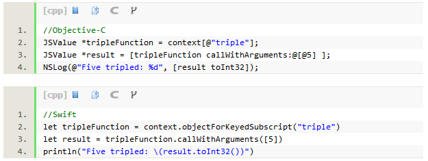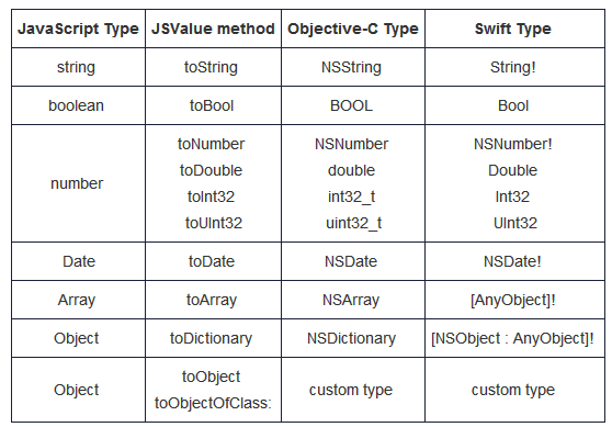 我们可以将Foundation类作为参数,从Objective-C/Swift代码上直接调用封装在JSValue的JavaScript函数。这里,JavaScriptCore再次发挥了衔接作用。