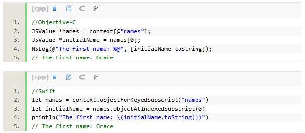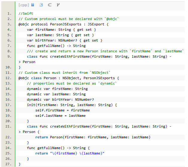 注意:JavaScriptCore实现了Objective-C/Swift的方法名和JavaScript代码交互。因为JavaScript没有命名好的参数,任何额外的参数名称都采取驼峰命名法(Camel-Case),并附加到函数名称上。在此示例中,Objective-C的方法createWithFirstName:lastName:在JavaScript中则变成了createWithFirstNameLastName()。