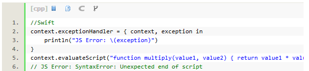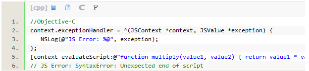 JSContext还有一个独门绝技,就是通过设定上下文环境中exceptionHandler的属性,可以检查和记录语法、类型以及出现的运行时错误。exceptionHandler是一个回调处理程序,主要接收JSContext的reference,进行异常情况处理。