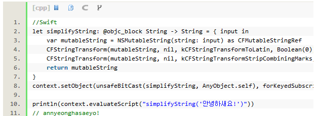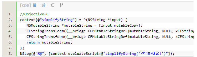 在JSContext中,如果Objective-C代码块赋值为一个标识符,JavaScriptCore就会自动将其封装在JavaScript函数中,因而在JavaScript上使用Foundation和Cocoa类就更方便些——这再次验证了JavaScriptCore强大的衔接作用。现在CFStringTransform也能在JavaScript上使用了,如下所示: