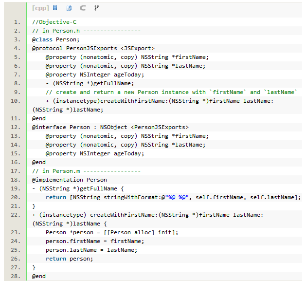 Person类执行的PersonJSExports协议具体规定了可用的JavaScript属性。,在创建时,类方法必不可少,因为JavaScriptCore并不适用于初始化转换,我们不能像对待原生的JavaScript类型那样使用var person = new Person()。