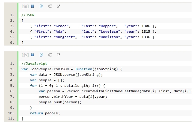 以下简单列出一个JSON范例,以及用JSON来创建新Person实例。