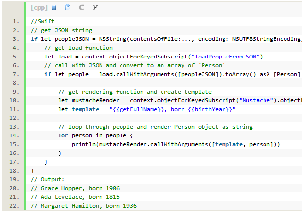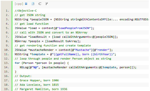 现在你只需加载JSON数据,并在JSContext中调用,将其解析到Person对象数组中,再用Mustache模板渲染即可: