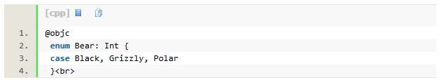 - Swift中的枚举类型现在可以通过@objc关键字导出到Objective-C中。@objc的枚举类型必须定义一个整型的原始类型,并且该枚举不能泛型化或者不能使用关联值。由于Objective-C中的枚举类型没有命名空间,所以导出到Objective-C中的枚举类型以枚举名字和case项目名字的组合的方式使用。 比如在Swift中的声明: