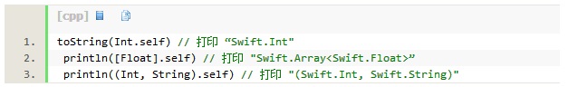 - 类型值在println函数或者字符串内插算法中现在可以打印完整的类型名称了: