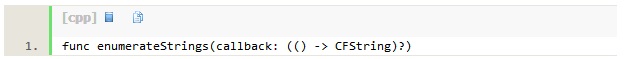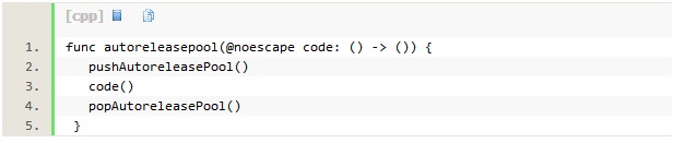 - 一个新的“@noescape”属性可以用在函数的闭包参数上,这意味着这个参数是唯一可被调用的(或者用在函数调用时以参数的方式出现),其意思是它的生命周期比函数调用的周期短,这有助于一些小小的性能优化,但最重要的是它屏蔽了闭包中对self.的需求。这使得函数的控制流比其他更加透明。在未来的beta版本中,标准库函数将普遍采用这种特性,比如autoreleasepool():