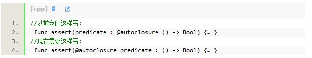 - @autoclosure现在标注在参数上,而不是标注在参数的类型上。比如: