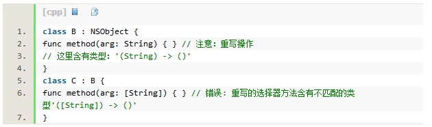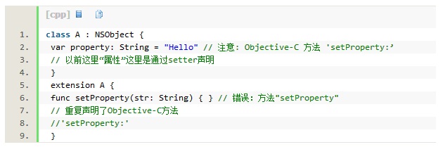 - Swift现在可以检测在Swift类型系统中覆盖和重写的差异以及通过Objective-C运行时可见的影响。比如,下面Objective-C类中对属性的setter和类扩展中对方法的“setProperty”它们之间的冲突现在可以被诊断: