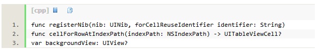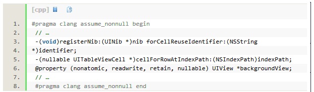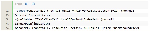 - Objective-C API中可以表示参数,返回值,属性,变量等等的“nullability”属性。比如,下面是表达很多UITableView API的为空特性: