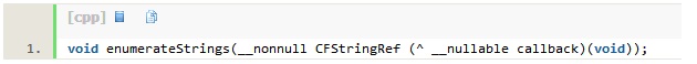 - 特别是在Objective-C API中,很多指针倾向于nonnull,因此Objective-C提供了“audited”域(通过新的#pragma),它会认为未被标注的指针为nonnull,比如下面的例子等同于上面第一个例子,但是它用的是“audited”域来简化语句表达: