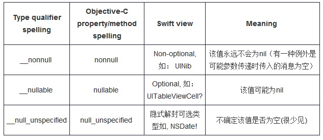 这个nullability标示符影响了Objective-C API在Swift的可选类型值,nonnull标示符标示的类型将会以非可选的类型的导入,这个用来替代隐式解封可选类型如(e.g., UINib!)。而nullable标示符标示的类型则会以可选类型导入(如UITableViewCell?),所以下面的API在Swift中表现如下: