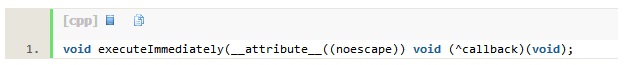 - 可空特性标示符也可以用在指针类型,包括C指针,block指针和C++成员指针,使用双下划线方式,比如: