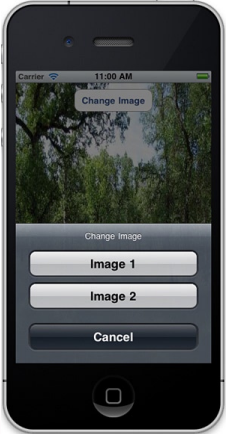 -(IBAction) changePicture: (id) sender{ UIActionSheet *changeImageSheet = [[UIActionSheet alloc] initWithTitle:@"Change Image" delegate:self cancelButtonTitle:@"Cancel" destructiveButtonTitle:NULL otherButtonTitles:@"Image 1", @"Image 2", NULL]; [changeImageSheet showInView:imageView]; [changeImageSheet release]; } |