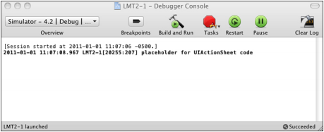 应用程序运行后,从Xcode运行调试器控制台(Run→Console)。在触碰应用程序的按钮后,会在控制台看到如图2-5所示的日志信息。