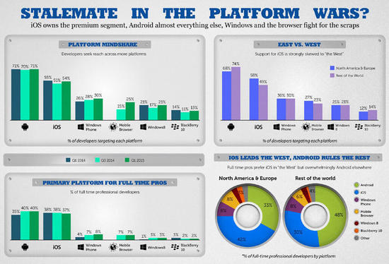 另一方面,2014年HTML5的大热与定稿也直接促使移动Web应用开发成为越来越多的开发者的心头好,从2014年Q3到2015年Q1,移动浏览器的平台心理份额从15%飞跃至25%,赶超Win8,成为Android、iOS和WP之后的第四大平台。
