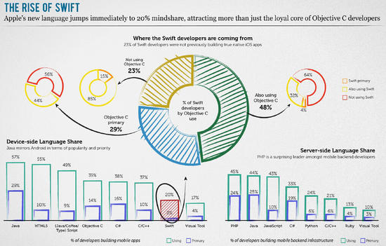 此外,有23%的Swift新手并没有使用Objective-C,这也就意味着,Swift为苹果的iOS生态圈出了不少力,成功地吸引了更多的开发者来构建原生的iOS应用。